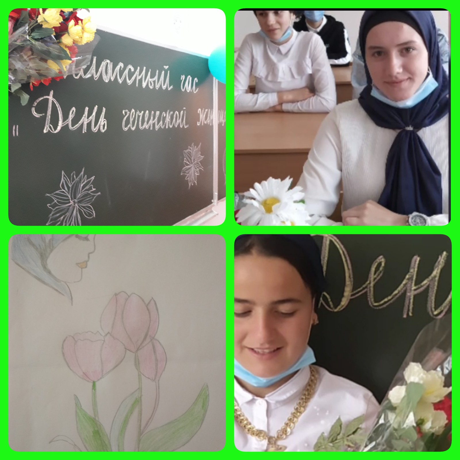 19.09.2020В целях усиления роли чеченской женщины в жизни общества в нашей школе прошли мероприятия приуроченные Ко Дню Чеченской Женщины. Данные мероприятия были организованы именно для них-наших милых, добрых, красивых мам, бабушек, сестёр и дочерей. Во всех классах прошли тематические классные часы посвященные дню Чеченской Женщины, были проведены конкурсы рисунков, спортивные соревнования, литератрно-музыкальные композиции.