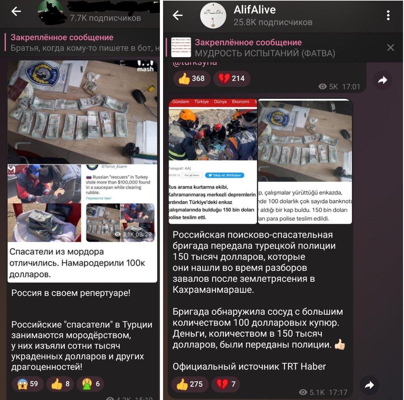 10.03.2023Последние события в Турции. Когда весь мир сплотился и начал оказывать единую помощь турецкому народу, ичкерийцы, в обычной для них манере штампуют фейки и лживую пропаганду. Пример этому сегодняшняя новость о том, что российская поисково-спасательная бригада сегодня передала турецкой полиции 150 тысяч долларов. Ичкериские новостные группы со всей лживой натурой выставили её как -«Россия в своем репертуаре! Российские спасатели в Турции занимаются мородёрством, у них изъяли сотни тысяч украденных долларов и других драгоценностей!»